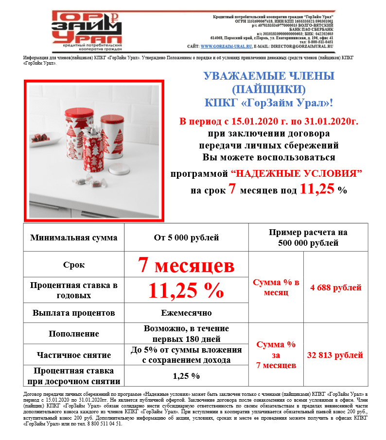 В период с 15.01.2020 по 31.01.2020 гг. при заключении договора передачи личных сбережений Вы можете воспользоваться программой «НАДЁЖНЫЕ УСЛОВИЯ» на срок 7 месяцев под 11,25% годовых!