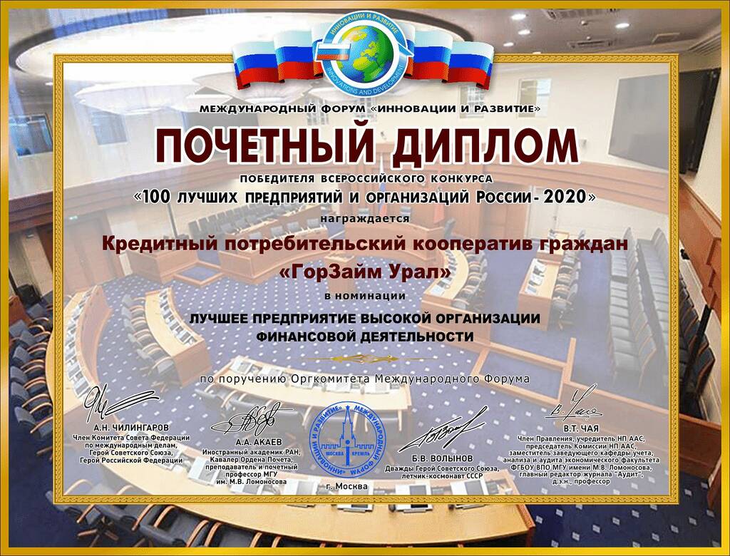По решению Оргкомитета Международного Форума «Инновации и развитие» КПКГ «ГорЗайм Урал» присужден почетный диплом победителя Всероссийского конкурса «100 лучших предприятий и организаций России — 2020» в номинации «ЛУЧШЕЕ ПРЕДПРИЯТИЕ ВЫСОКОЙ ОРГАНИЗАЦИИ ФИНАНСОВОЙ ДЕЯТЕЛЬНОСТИ».