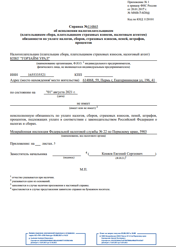 Отчет по форме 6 НДФЛ по доходам сотрудников и сберегателей, исчисленных и удержанных налоговым агентом, Расчет по страховым взносам сданы в ИФНС своевременно. Начисление налогов и взносов и их отчисление в государственные органы в полугодии 2021г. производилось своевременно и в полном объёме. В установленные сроки были оплачены членские взносы в Ассоциацию “Саморегулируемая организация кредитных кооперативов “Содействие”, авансовый платеж по налогу, уплачиваемый в связи с применением УСН. КПКГ «ГорЗайм Урал» не имеет неисполненных обязательств по уплате налогов и сборов в соответствии с законодательством Российской Федерации о налогах и сборах по состоянию на 01 августа 2021 г., что подтверждает справка №114865, выданная Межрайонной ИФНС России №22 по Пермскому краю.