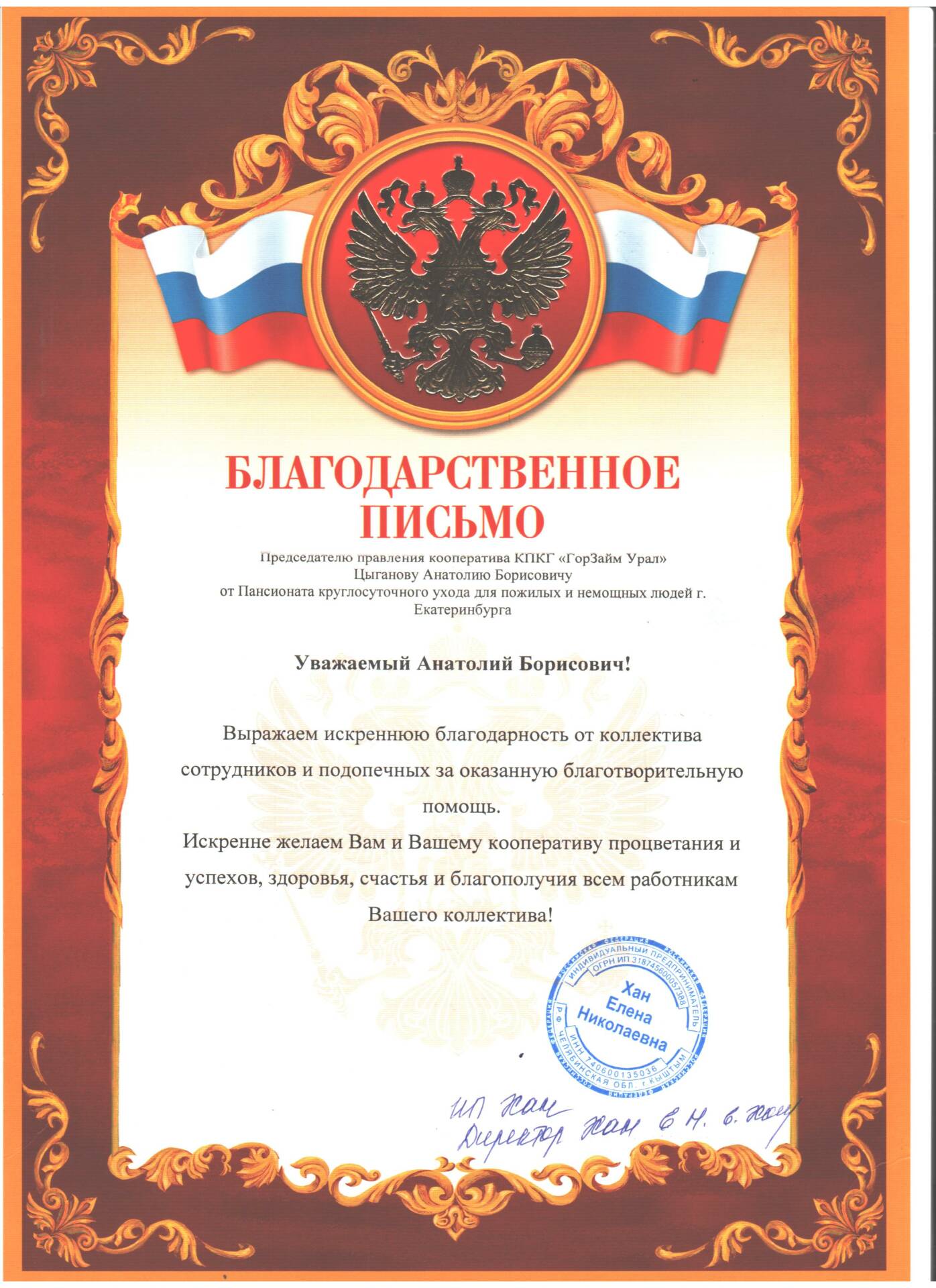 В условиях пандемии были соблюдены все необходимые меры безопасности, на территорию пансионата разрешили пройти одному сотруднику с предъявлением справки о вакцинации и в маске. Ведущий специалист отдела по работе с клиентами Протасенко Алёна Викторовна от лица Правления кооператива и от всех сотрудников поздравила каждого подопечного пансионата лично.