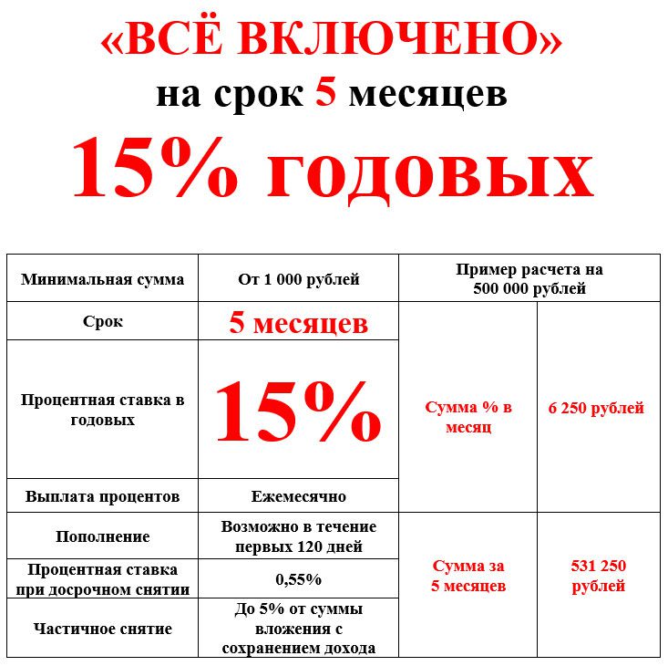Договор передачи личных сбережений по программе “ВСЕ ВКЛЮЧЕНО” может быть заключен только с членами (пайщиками) КПКГ”ГорЗайм Урал” в период с 01.11.2021г. по 30.11.2021г. Не является публичной офертой. Член (пайщик) КПКГ” ГорЗайм Урал ” обязан солидарно нести субсидиарную ответственность по своим обязательствам в пределах невнесенной части дополнительного взноса каждого из членов(пайщиков) КПКГ” ГорЗайм Урал ”. При вступлении в кооператив уплачивается обязательный паевой взнос 50 руб., вступительный взнос 50 руб. Заключение договора после ознакомления со всеми условиями в офисе. Дополнительную информацию об акции, условиях, сроках и месте ее проведения можете получить в офисах КПКГ” ГорЗайм Урал ” или по тел.88005110451.