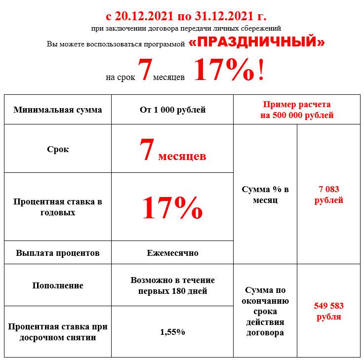 Договор передачи личных сбережений по программе «ПРАЗДНИЧНЫЙ» может быть заключен только с членами (пайщиками) КПКГ «ГорЗайм Урал» в период с 20.12.2021 г. по 31.12.2021 г. Не является публичной офертой. Член (пайщик) КПКГ «ГорЗайм Урал» обязан солидарно нести субсидиарную ответственность по своим обязательствам в пределах невнесенной части дополнительного взноса каждого из членов (пайщиков) КПКГ «ГорЗайм Урал». При вступлении в кооператив уплачивается обязательный паевой взнос 50 руб., вступительный взнос 50 руб. Заключение договора после ознакомления со всеми условиями в офисе. Дополнительную информацию об акции, условиях, сроках и месте ее проведения можете получить в офисах КПКГ «ГорЗайм Урал» или по тел. 88005110451.