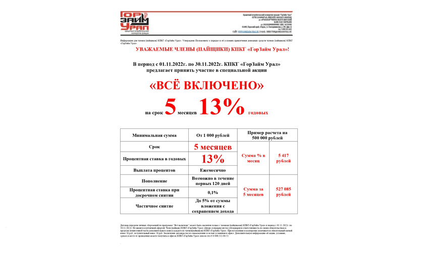 В период с 01.11.2022г. по 30.11.2022г. КПКГ «ГорЗайм Урал» предлагает принять участие в специальной акции